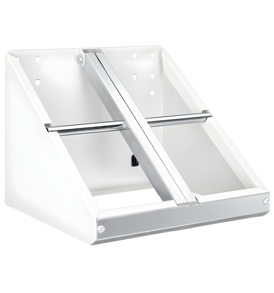 - Les dérouleurs papier. Disponibles en 2 versions : 300 mm ou 700 mm de longueur. Ils permettent de supporter des produits d’hygiène type essuie-tout. La seconde version peut accueillir des gros rouleaux industriels, type papier d’emballage, papier bulle ou papier kraft.
