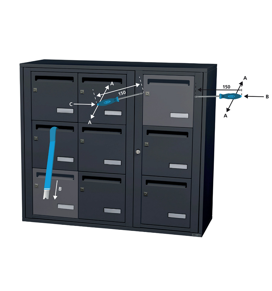 Notre boite aux lettres est conçue pour résister à l'arrachement et au vandalisme de niveau 3 (60 kg). Elles doivent résister aux tentatives d'ouverture forcée, aussi bien du côté de la serrure que du côté de la charnière (a). Elles doivent aussi passer l'épreuve de l'arrachement par la fente d'introduction du courrier (B).
