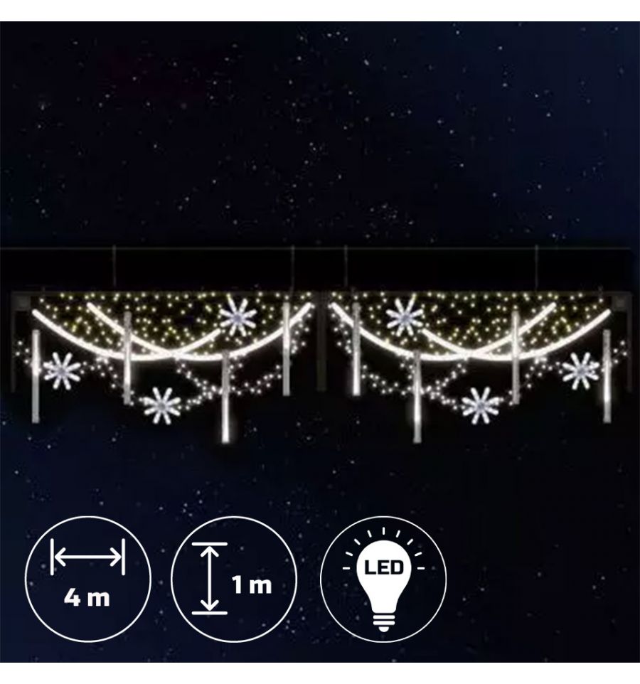 Notre traversée de rue de Noël est conçue pour mettre en lumière la magie des fêtes de fin d'année dans votre ville ou commune. Nous vous proposons ce motif Pluie étoilée composé de deux panneaux formant une traversée d'une longueur de 4 mètres sur une hauteur de 1 mètre. Équipée d'éclairage LED éclatant, cette décoration vous permet de créer une atmosphère féerique durant les périodes de fêtes, qui émerveillera habitants et visiteurs.