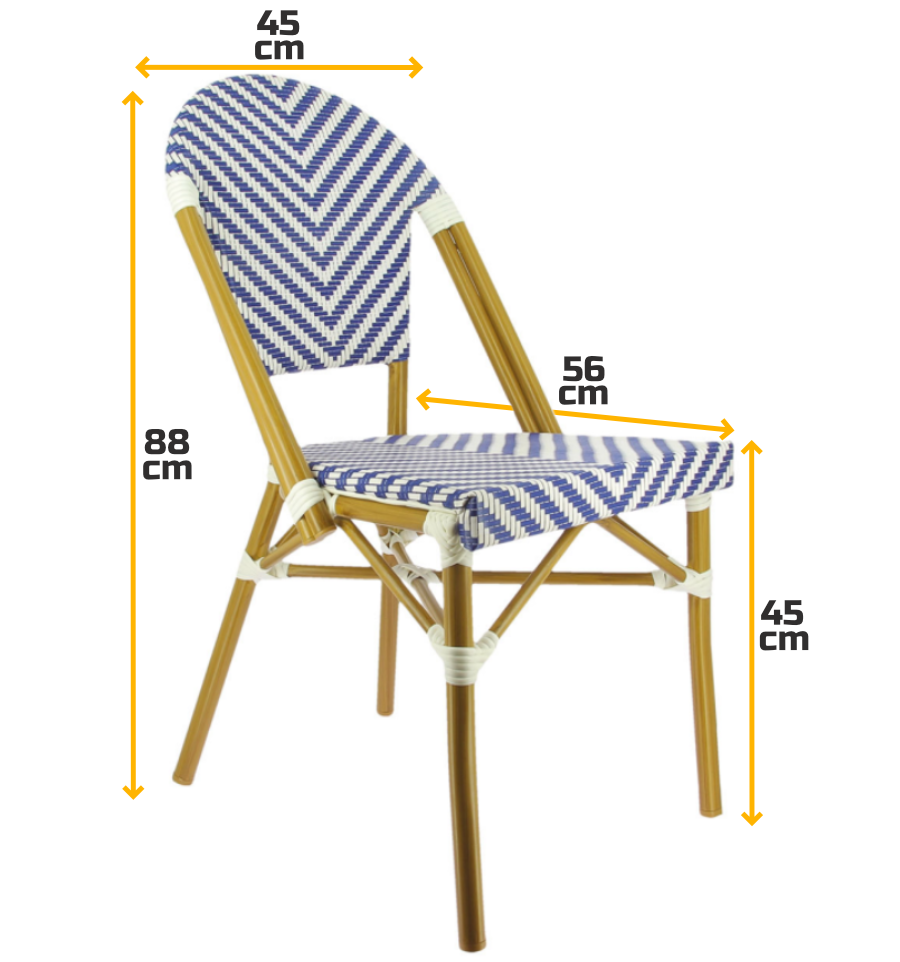 Notre chaise textilène empilable mesure 45 x 56 x 88 cm (L x P x H), avec une hauteur d'assise de 45 cm.
