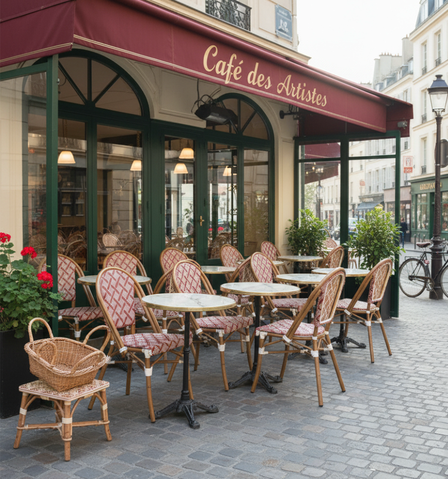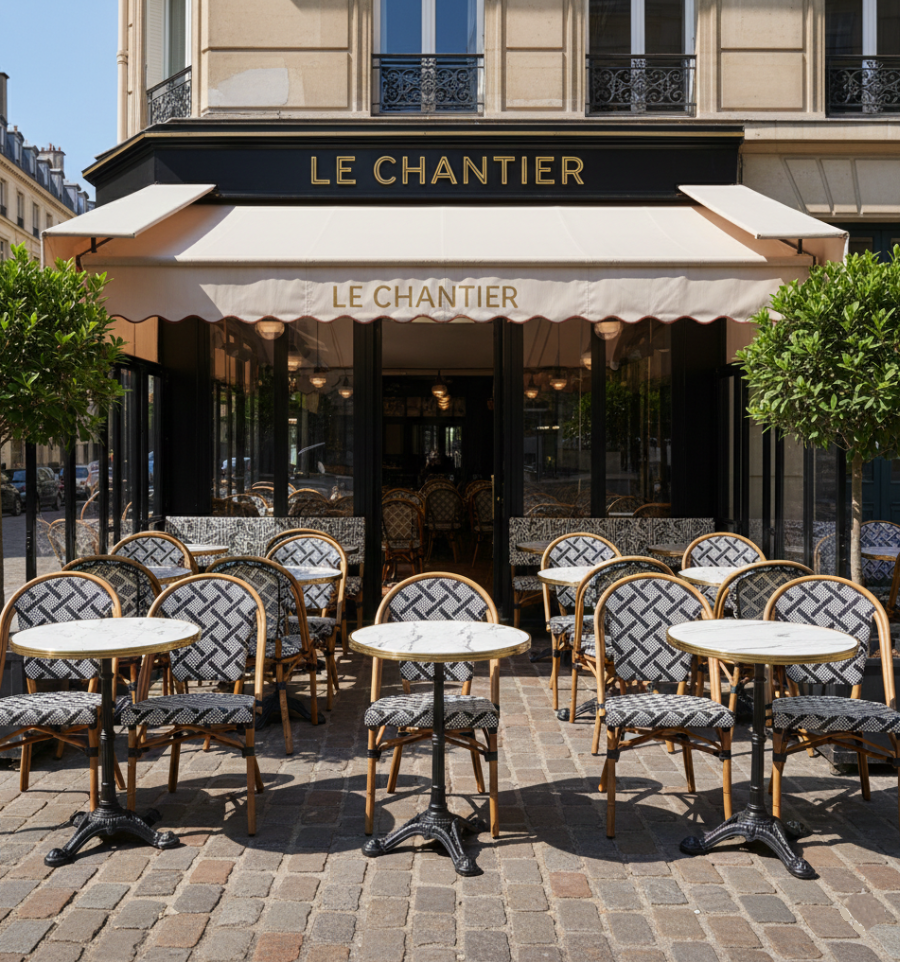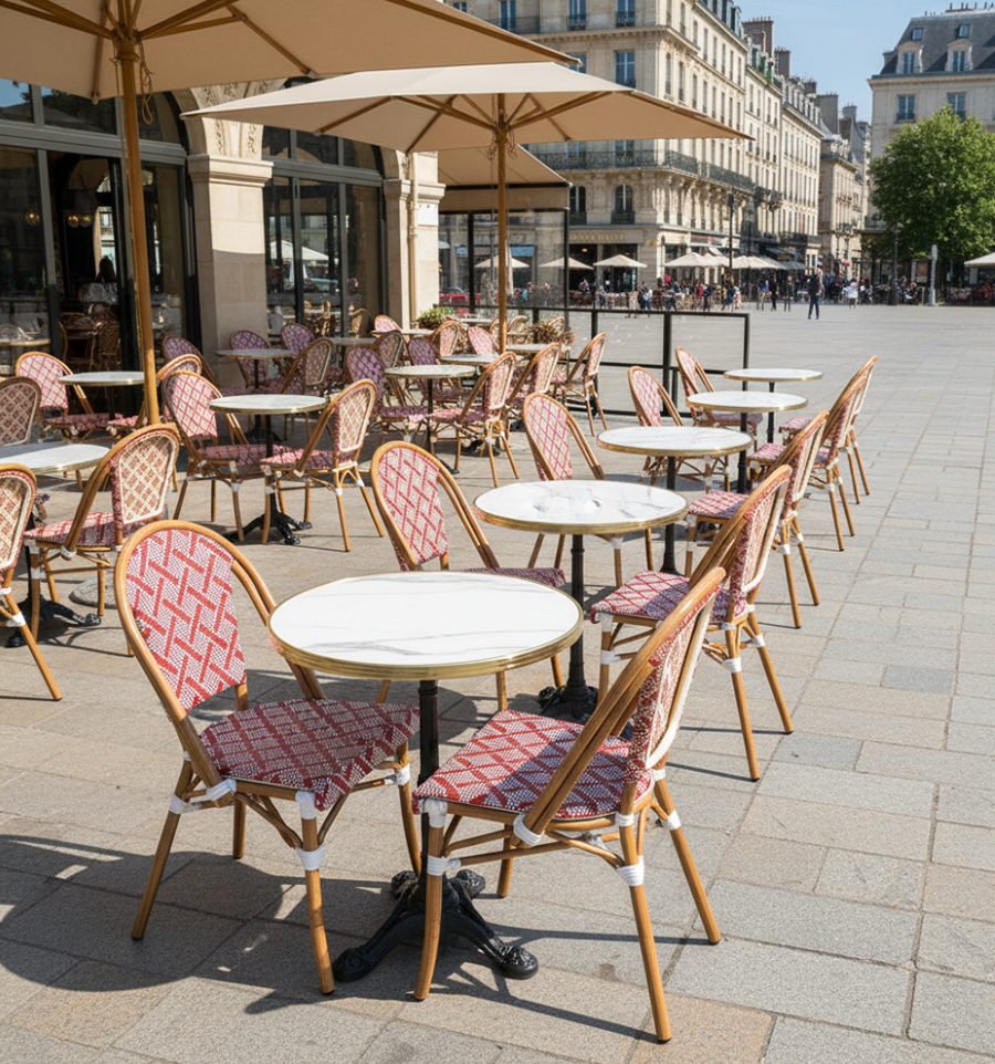 Elle reprend le style des chaises bistrot parisien avec une adaptation aux espaces extérieurs.