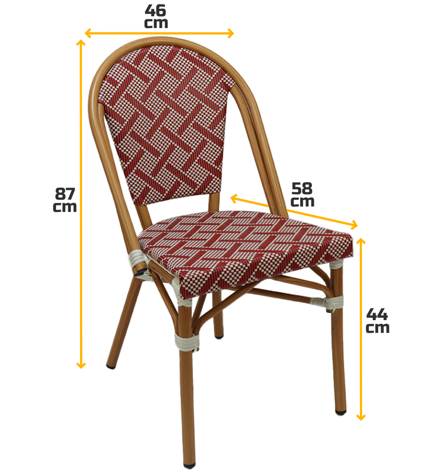 Notre chaise bistrot en aluminium et textilène mesure 46 x 58 x 87 cm (L x P x H), avec une hauteur d'assise de 44 cm.