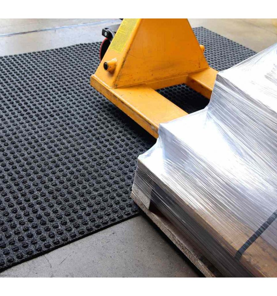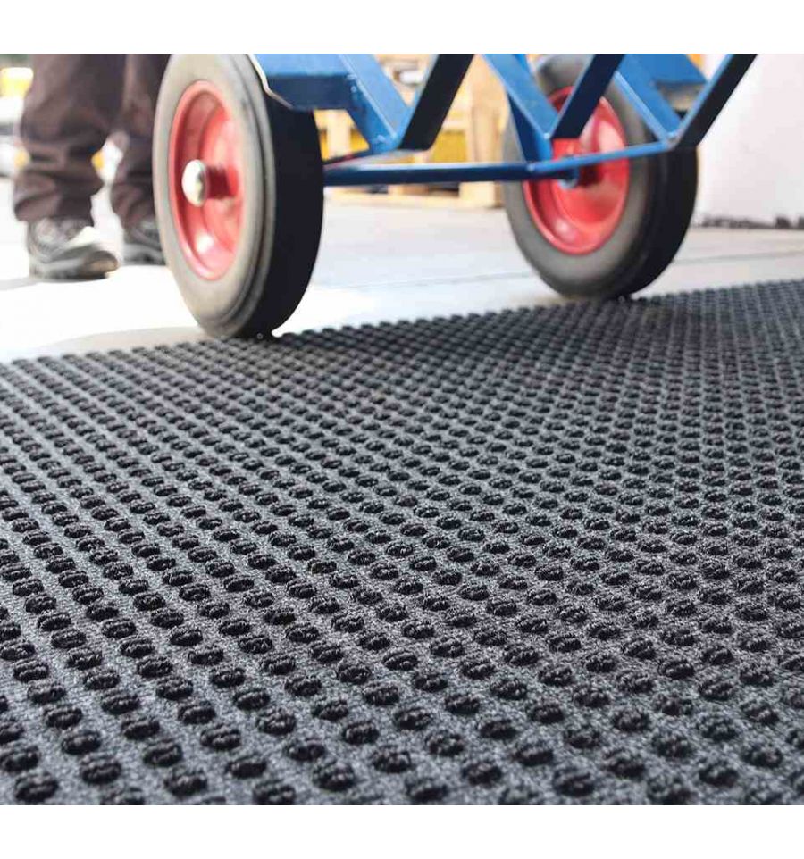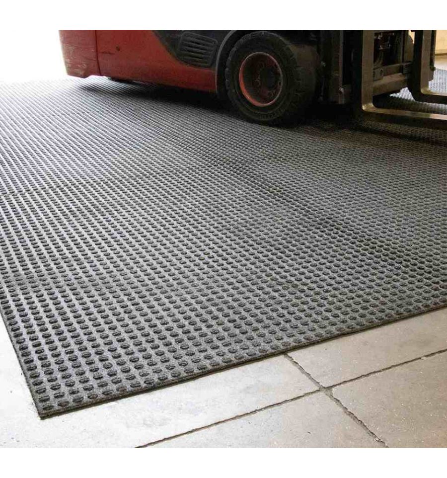 Grâce à sa surface gaufrée en polypropylène, il absorbe efficacement l'humidité et retient les saletés transportées par les roues des chariots élévateurs. Sa base en caoutchouc antidérapante assure une excellente stabilité au sol même dans les zones de fort passage, ce qui réduit tout éventuel accident.