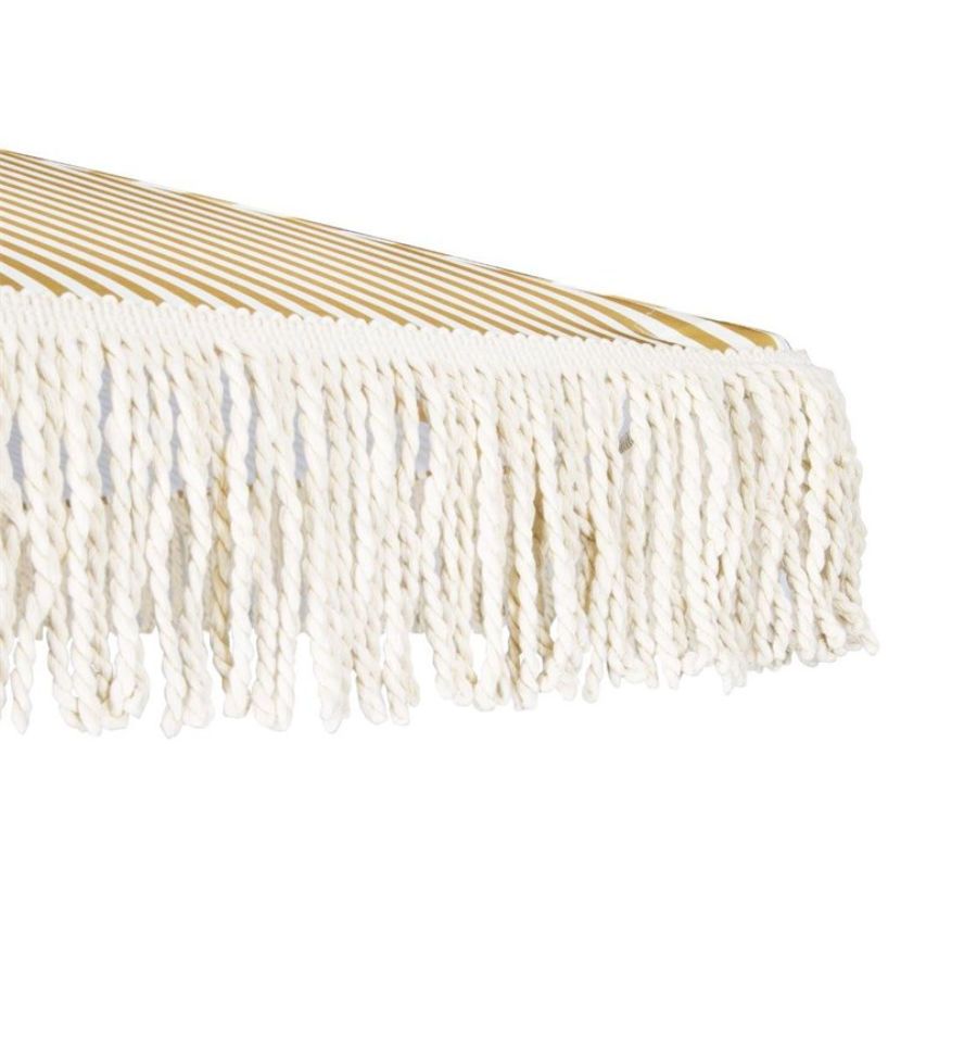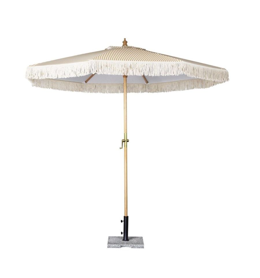 Le design des rayures blanches et beiges et des franges apportent une touche élégante et colorée et donne un look moderne, vintage et rafraîchissant à toute terrasse CHR.
