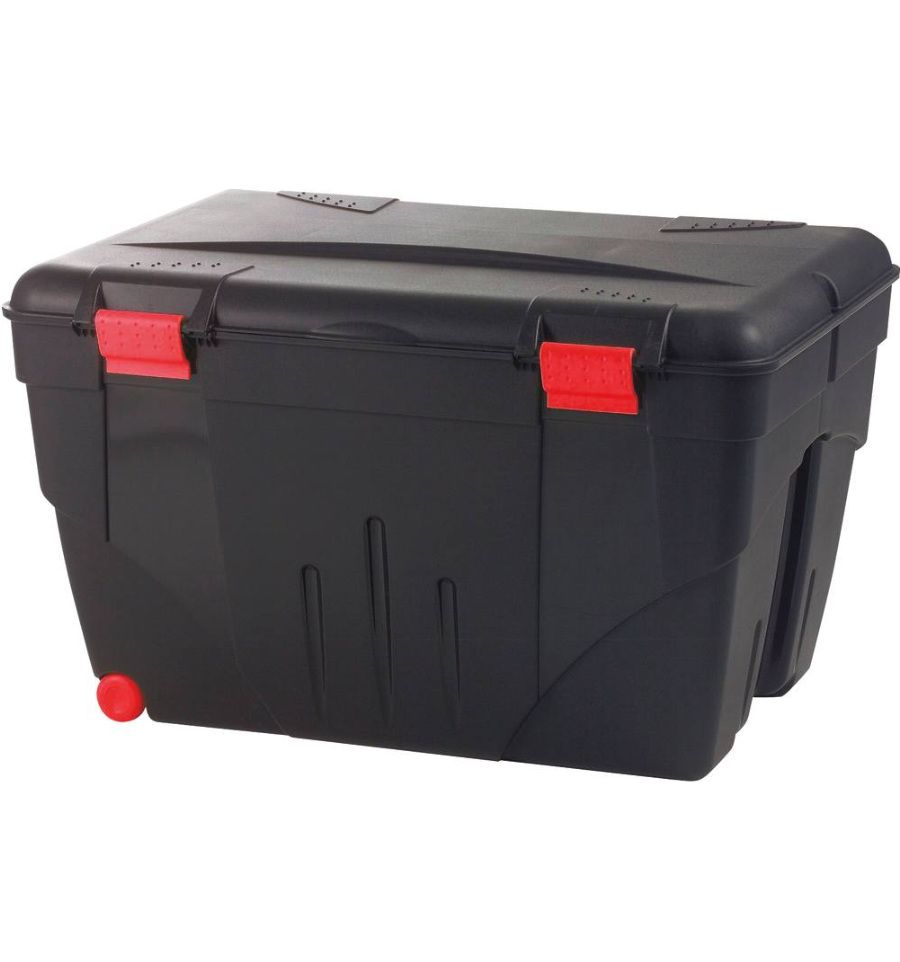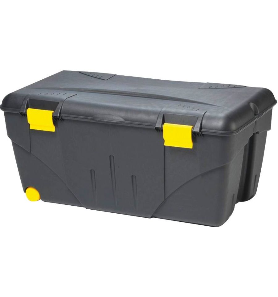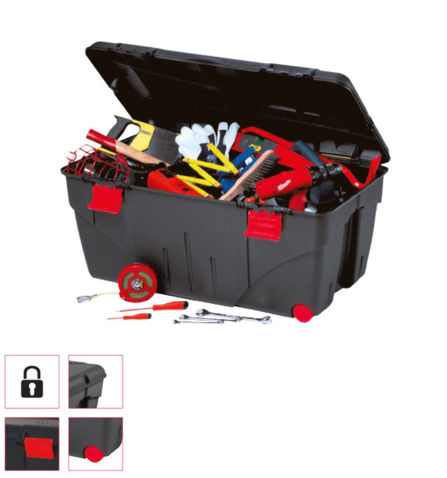 Ce coffre est équipé d'un couvercle à charnière et de poignées de verrouillage, cadenassable pour sécuriser vos outils. Il dispose également d'une poignée et de deux roulettes pour transporter aisément votre caisse.