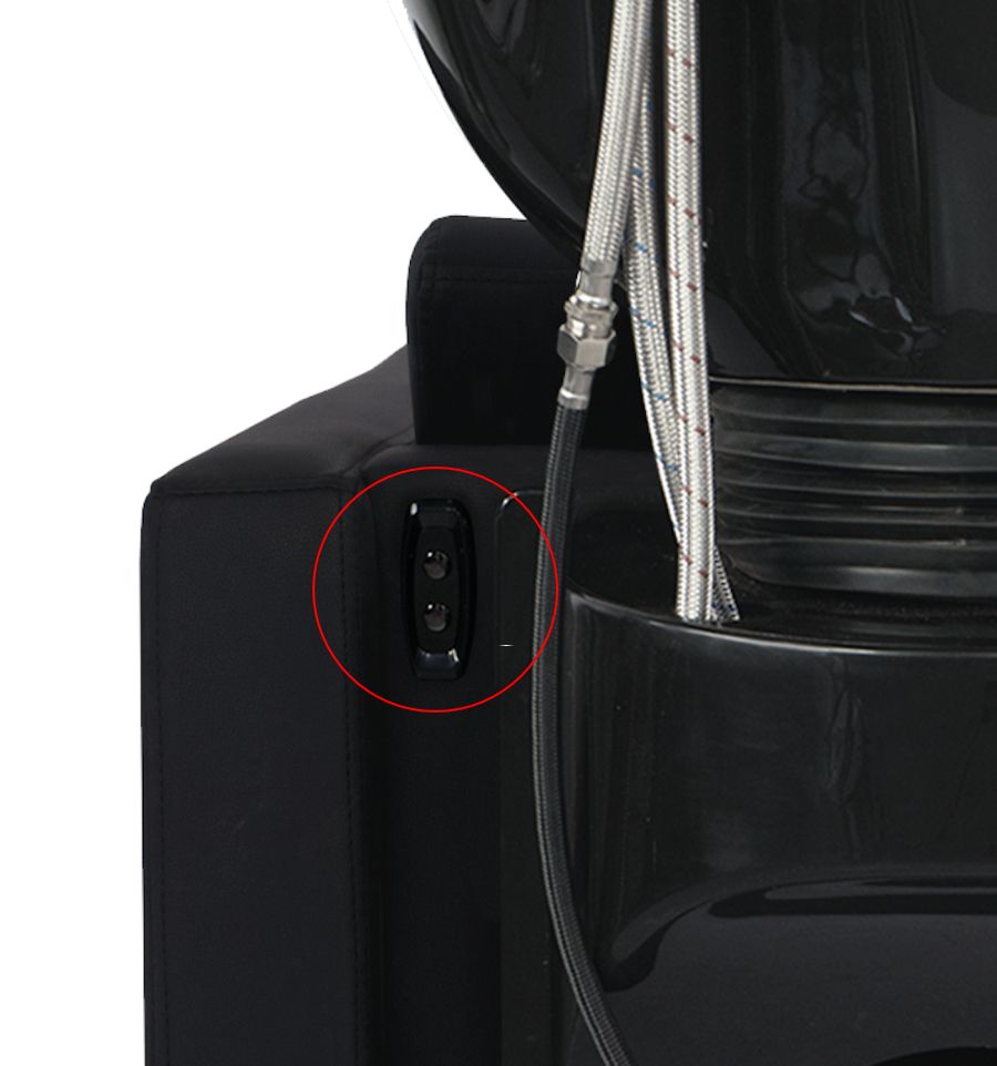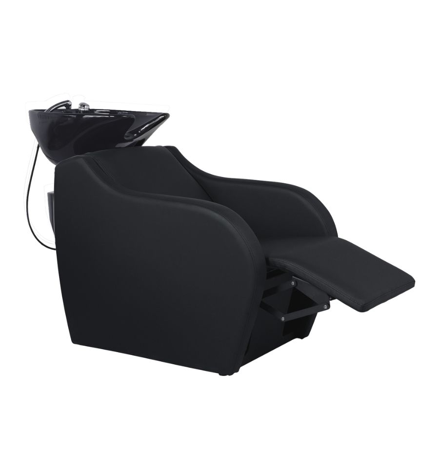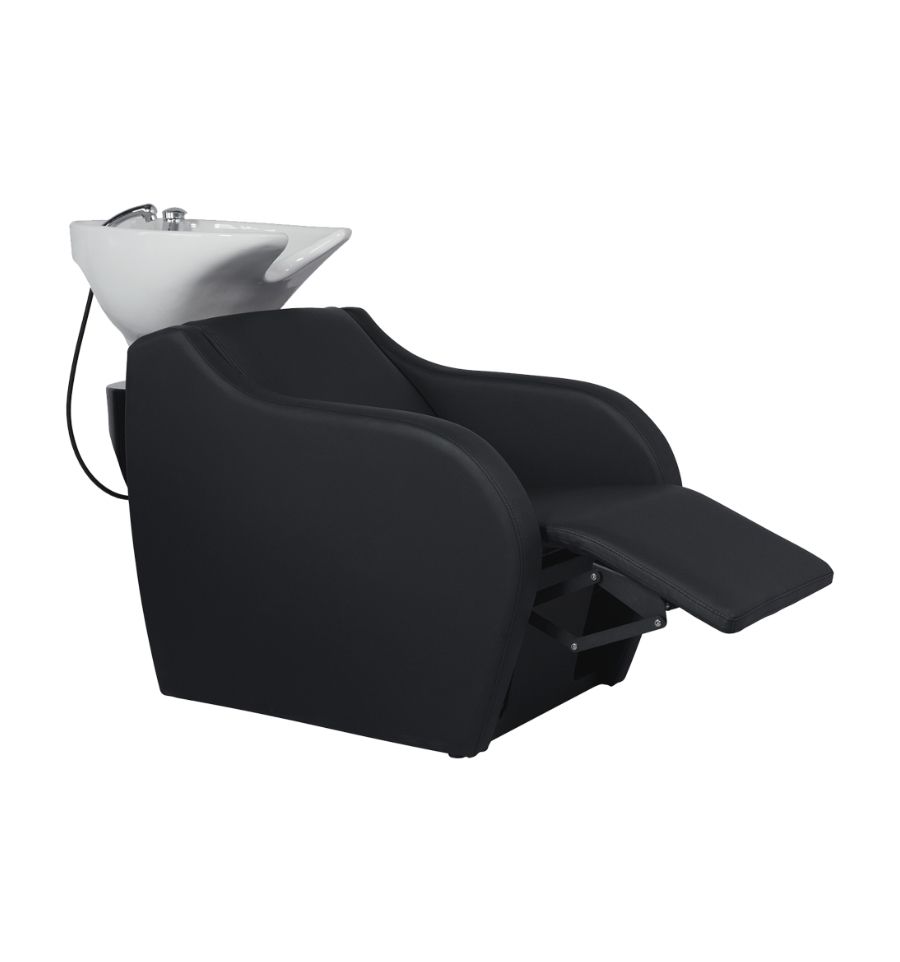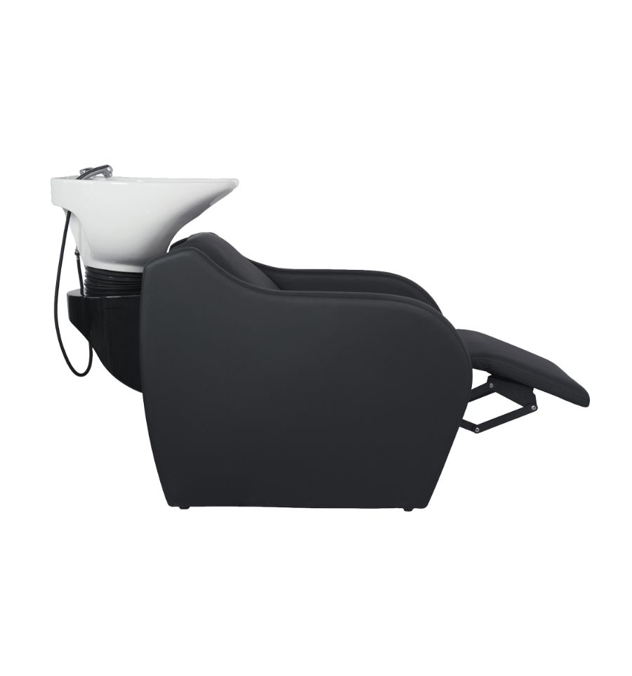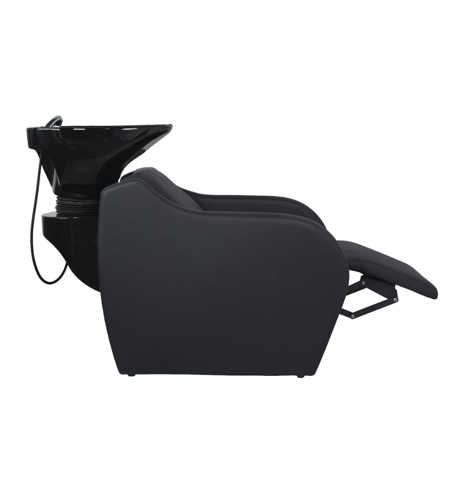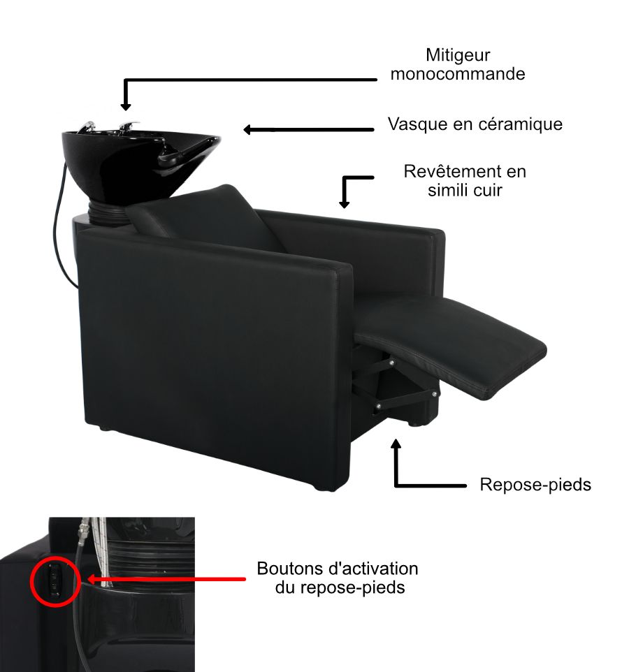 Montez et descendez le repose-pieds à l'aide du bouton situé à l'arrière du bac à shampoing. La structure en polyester renforcé, le revêtement du fauteuil en PVC noir, et la vasque en céramique assurent une résistance et une durabilité de votre matériel.