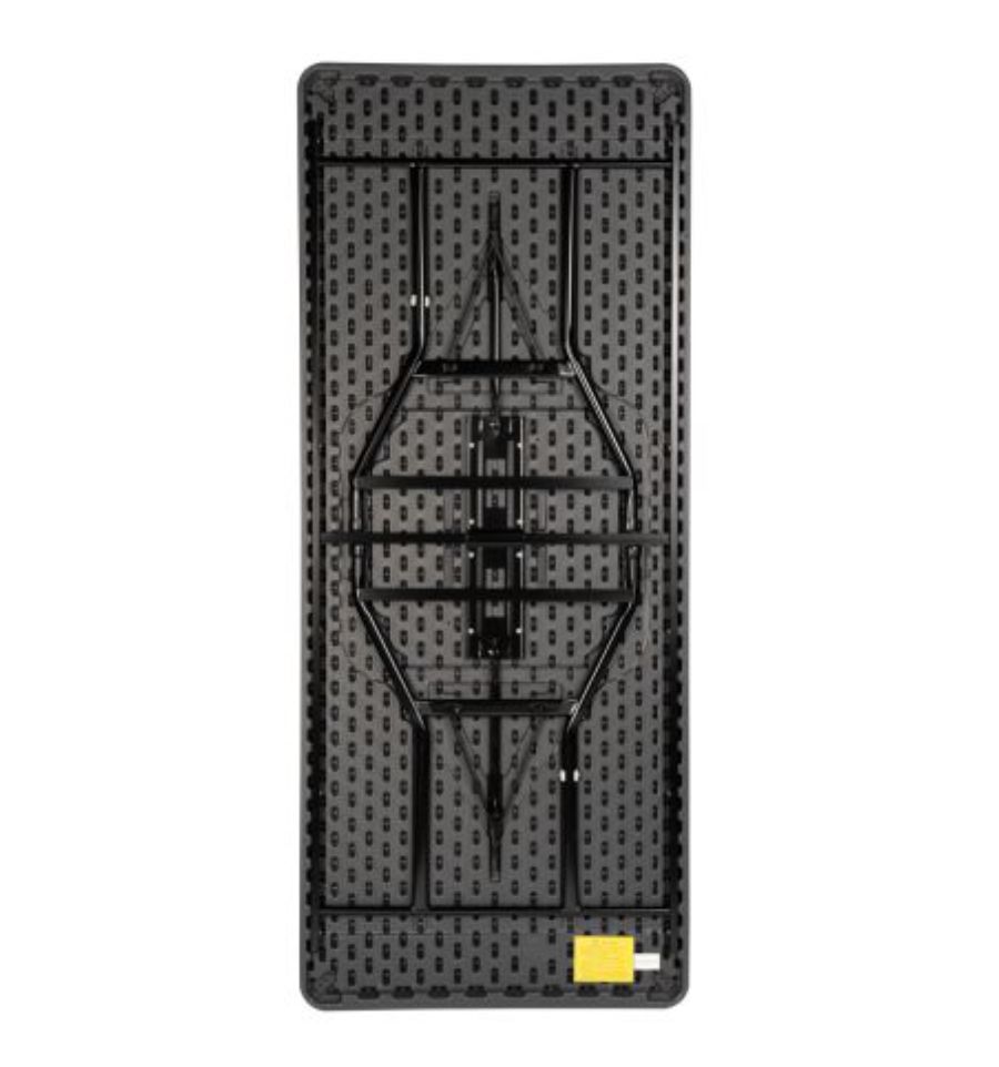 Lorsque la table pliante grise est dépliée, elle se verrouille grâce à des bagues de sécurité coulissantes qui empêchent le repli de la table. Lorsqu’elle est repliée, des clips ABS maintiennent les pieds pour un empilage et un transport plus simplifiés.