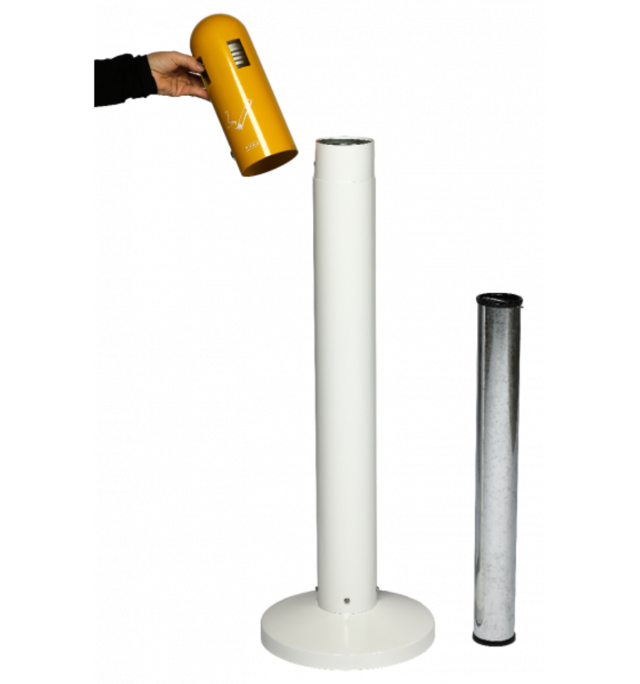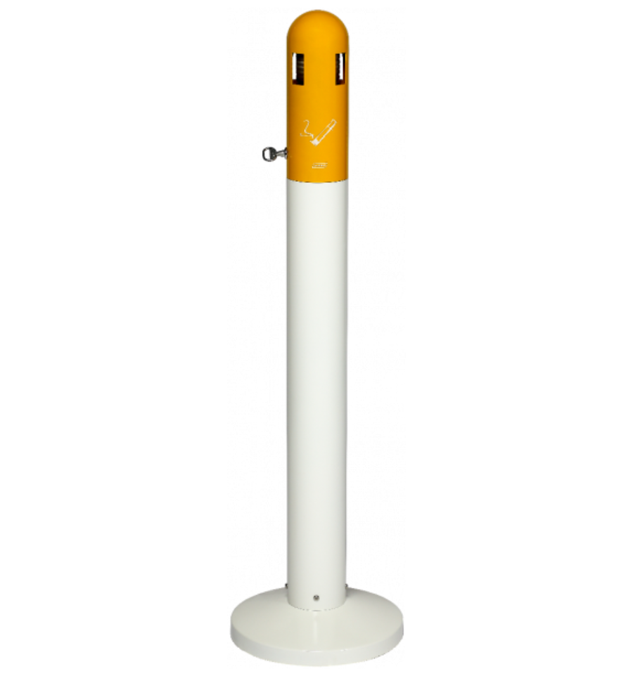 Ce cendrier en forme de cigarette de couleur blanche et orange RAL 1006 est conçu pour attirer l'attention et encourager son utilisation dans les espaces publics.