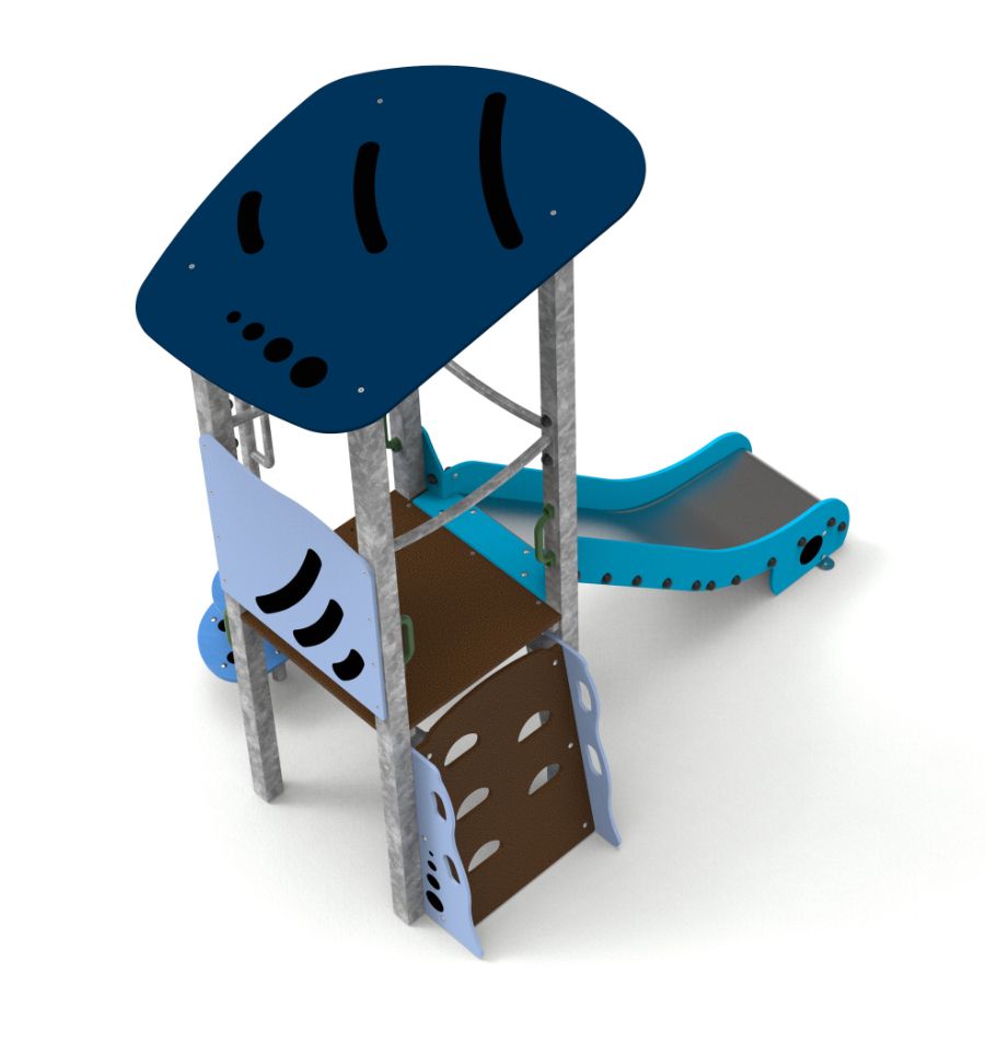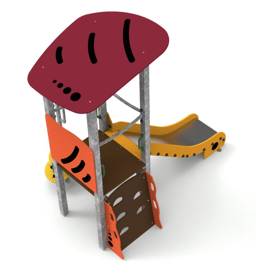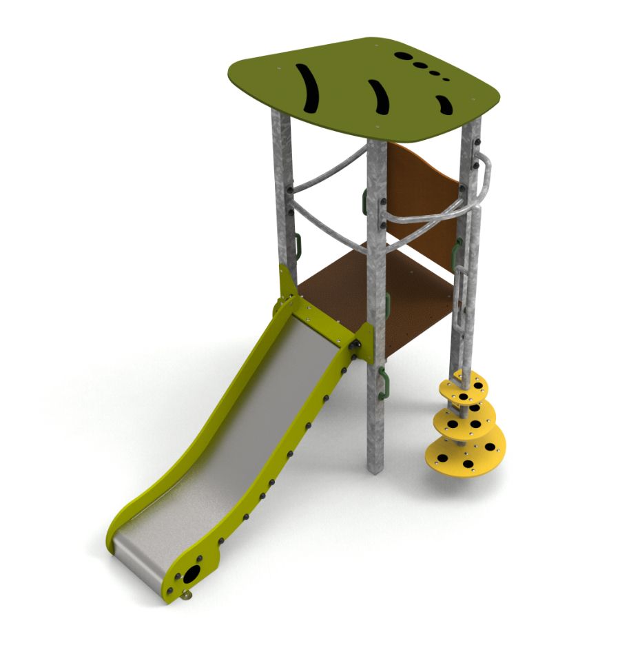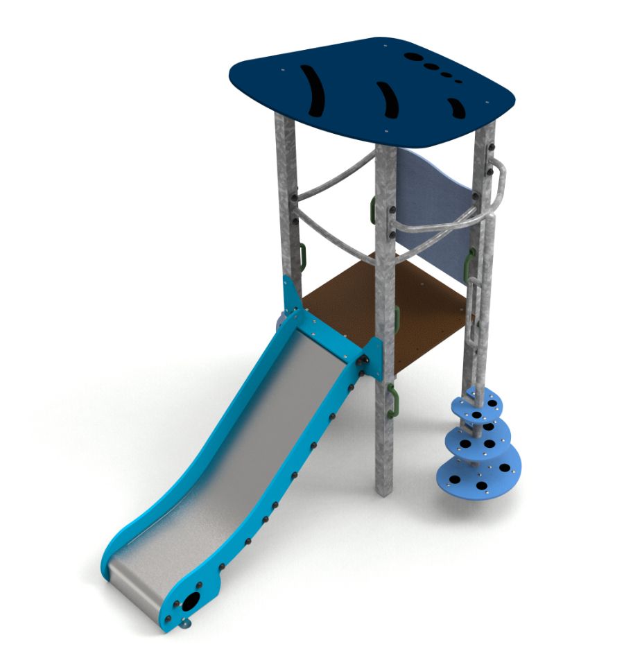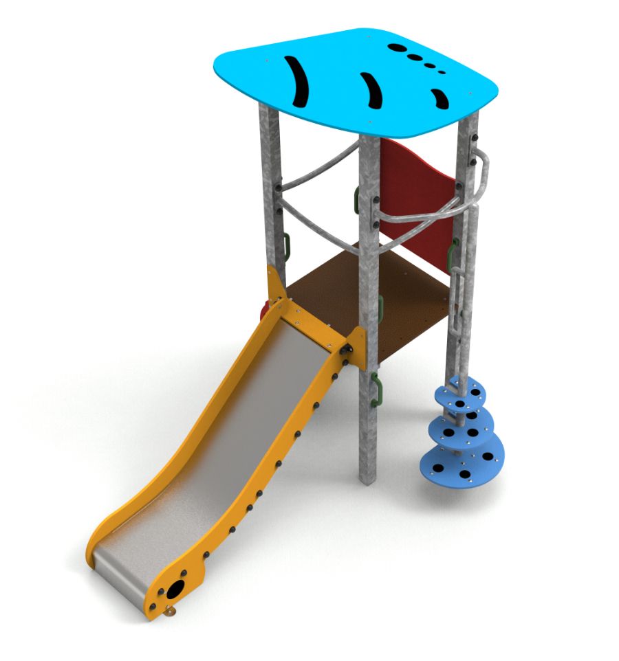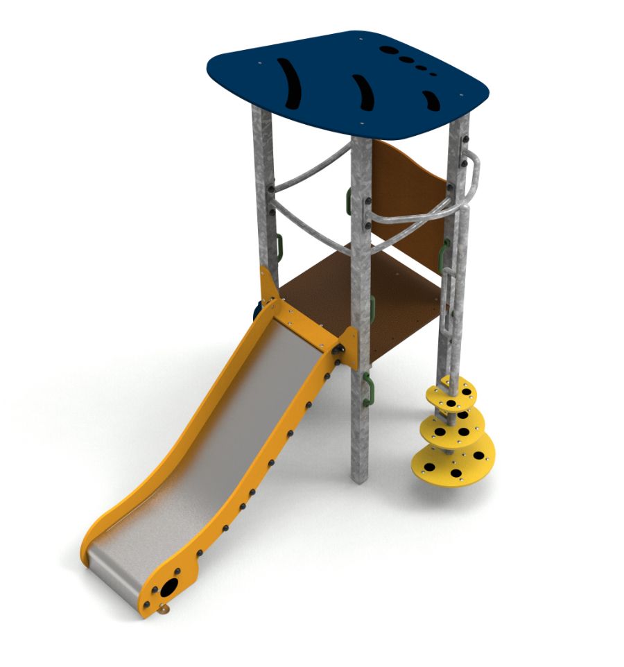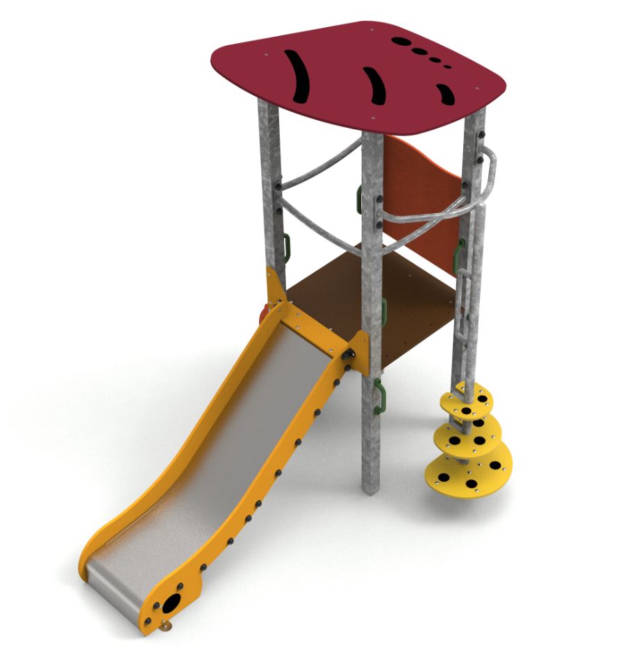 Notre structure de jeu extérieur est composée de 3 modules, un mur d'escalade, une barre de pompier avec plateformes et un toboggan en acier galvanisé.