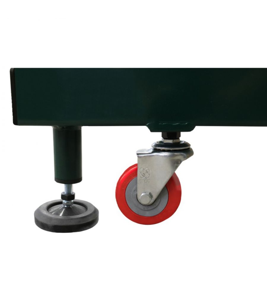Ces poteaux ont cinq pieds d'appui ajustables sur lesquels la structure repose pendant le jeu. Aussi, il n'est pas nécessaire de démonter la structure à chaque fois pour la déplacer. Enfin, le jeu est muni de cinq roues de couleur rouge.
