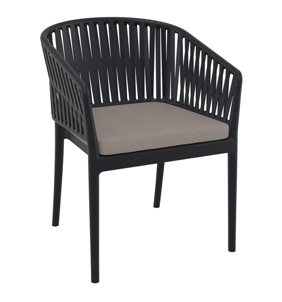 Ce fauteuil en polypropylène renforcé de fibre de verre est équipé d'un coussin d'assise et d'un dossier en ruban, alliant confort et design.