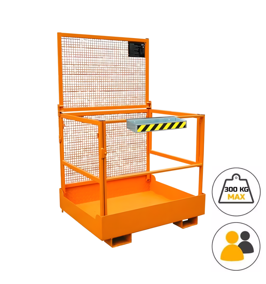 Cette nacelle est compatible avec les fourches des chariots élévateurs et est pliable pour faciliter son rangement et son transport.
