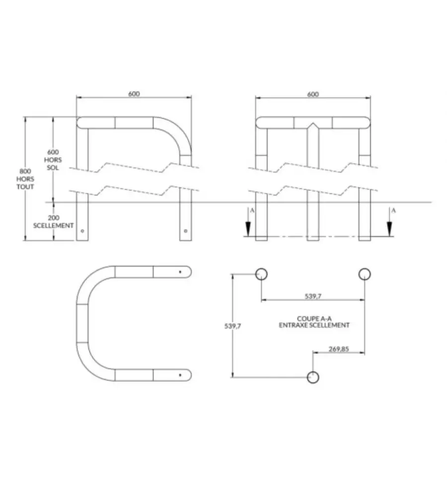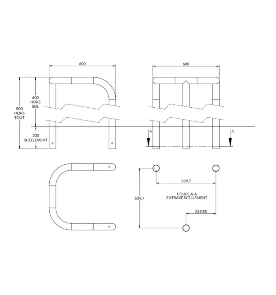 - Diamètre 60 mm x Longueur 600 mm x largeur 600 mm x hauteur hors sol 600 mm x hauteur hors tout 800 mm