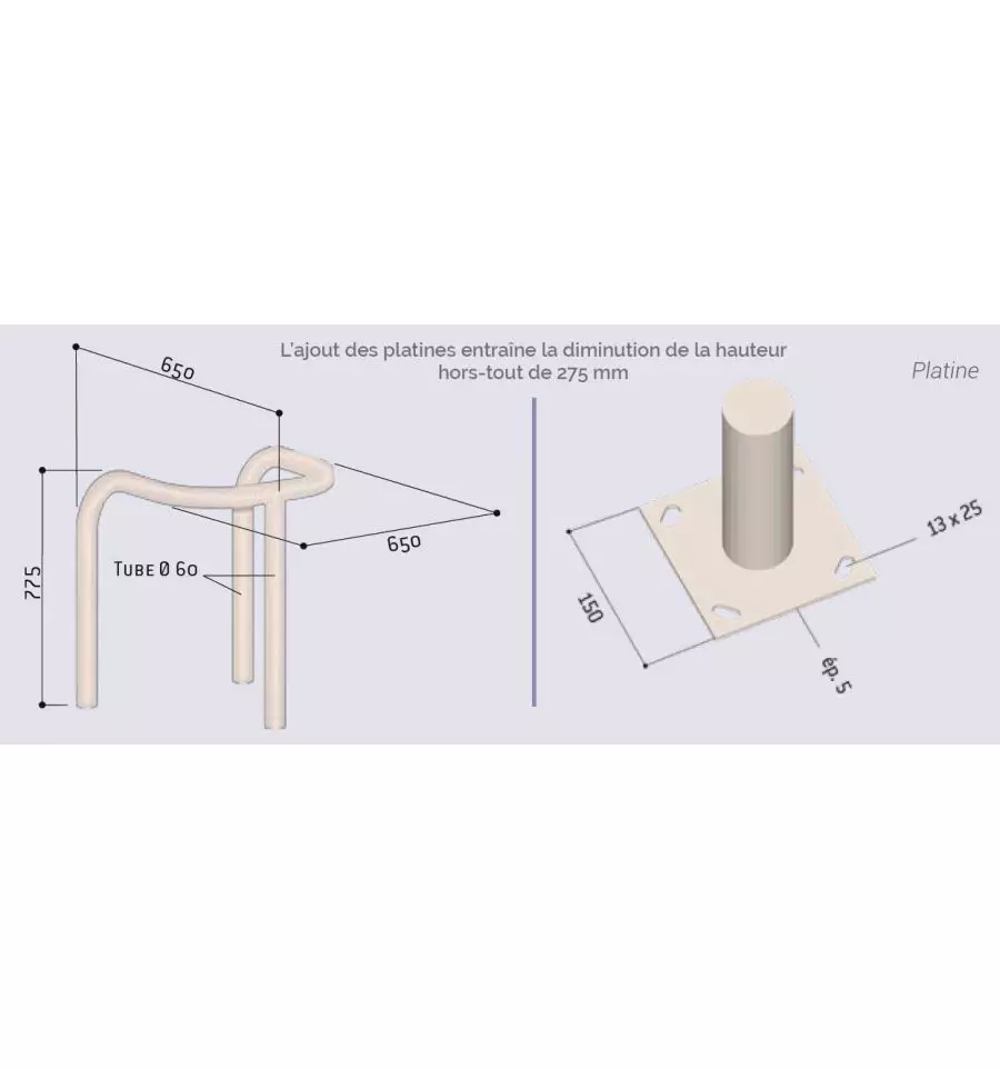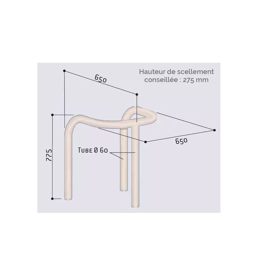 - Diamètre 60 mm x Longueur 650 mm x largeur 650 mm x hauteur hors sol 575 mm x hauteur hors tout 775 mm