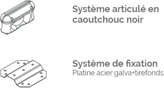 Composition du coffret : Le panneau (et le panonceau à la demande) + Le système articulé en caoutchouc + La platine de fixation + Les tirefonds