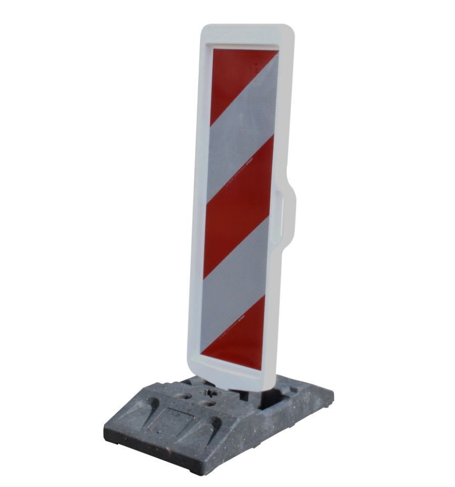 La balise se compose d'un élément rectangulaire en plastique PEHD (polyéthylène haute densité) avec une alternance de bandes blanches et rouges inclinées.