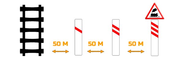 Lorsque l'automobiliste s'approche du passage à niveau, la première balise qu'il voit possède 3 bandes et se situe à 150 m du départ du passage.