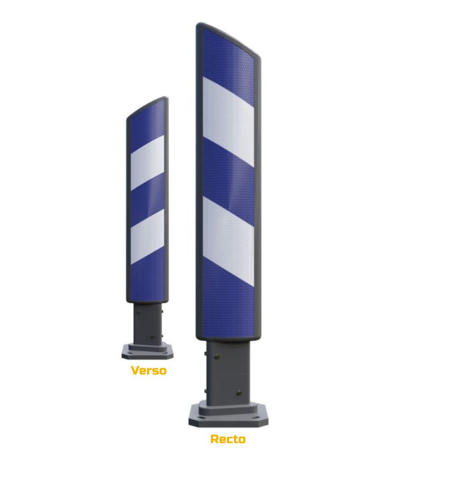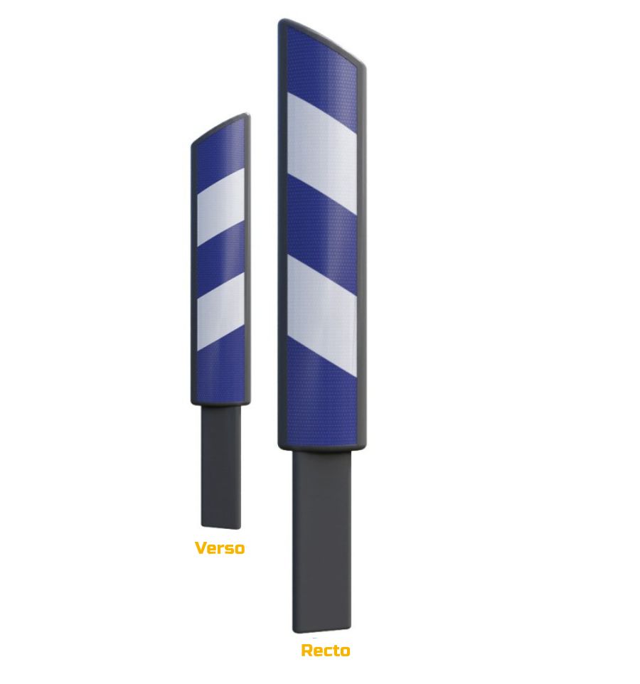 Cette balise est disponible en modèle simple face ou double-face selon le besoin. Pour le modèle simple face, il est nécessaire de savoir de quel côté sera implantée la balise avant de se la procurer. En effet, les bandes de la balise doivent toujours être orientées vers l'extérieur de la chaussée lorsque l'on parcourt des yeux la balise de l'intérieur vers l'extérieur de la chaussée et de bas en haut.