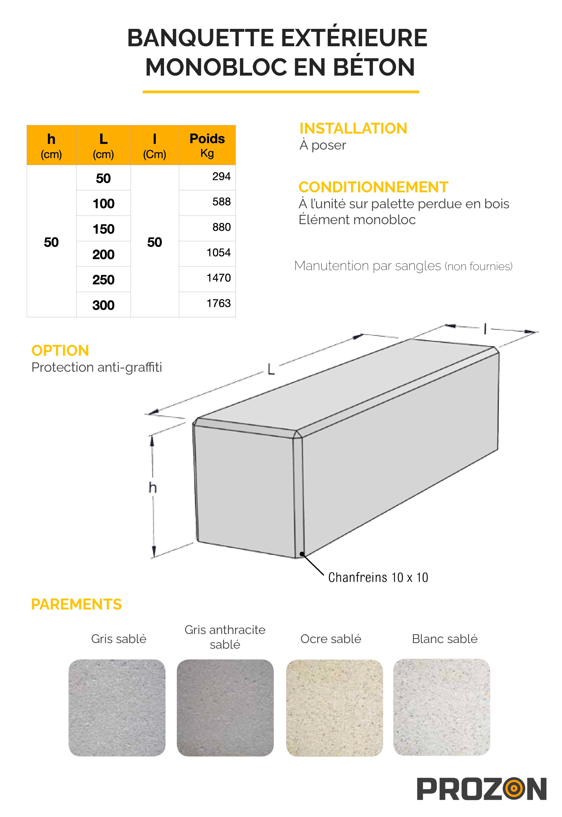 La banquette en béton, pesant entre 300 et 1650 kg en fonction de sa dimension, ne nécessite aucune fixation.