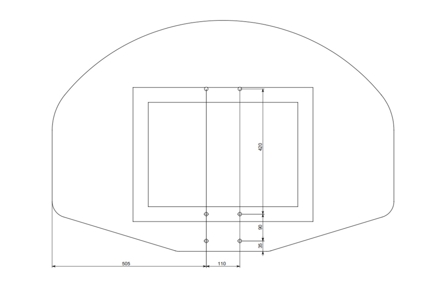 Le but de basket mural permet d'avoir deux hauteurs possibles, une à 2,60 m ou une à 3,05 m. Le réglage se fait à l'aide d'une manivelle. Le panneau demi-lune est en fibre de verre, il est de couleur blanche avec des lignes noires. Le déport est de 0,60 m.