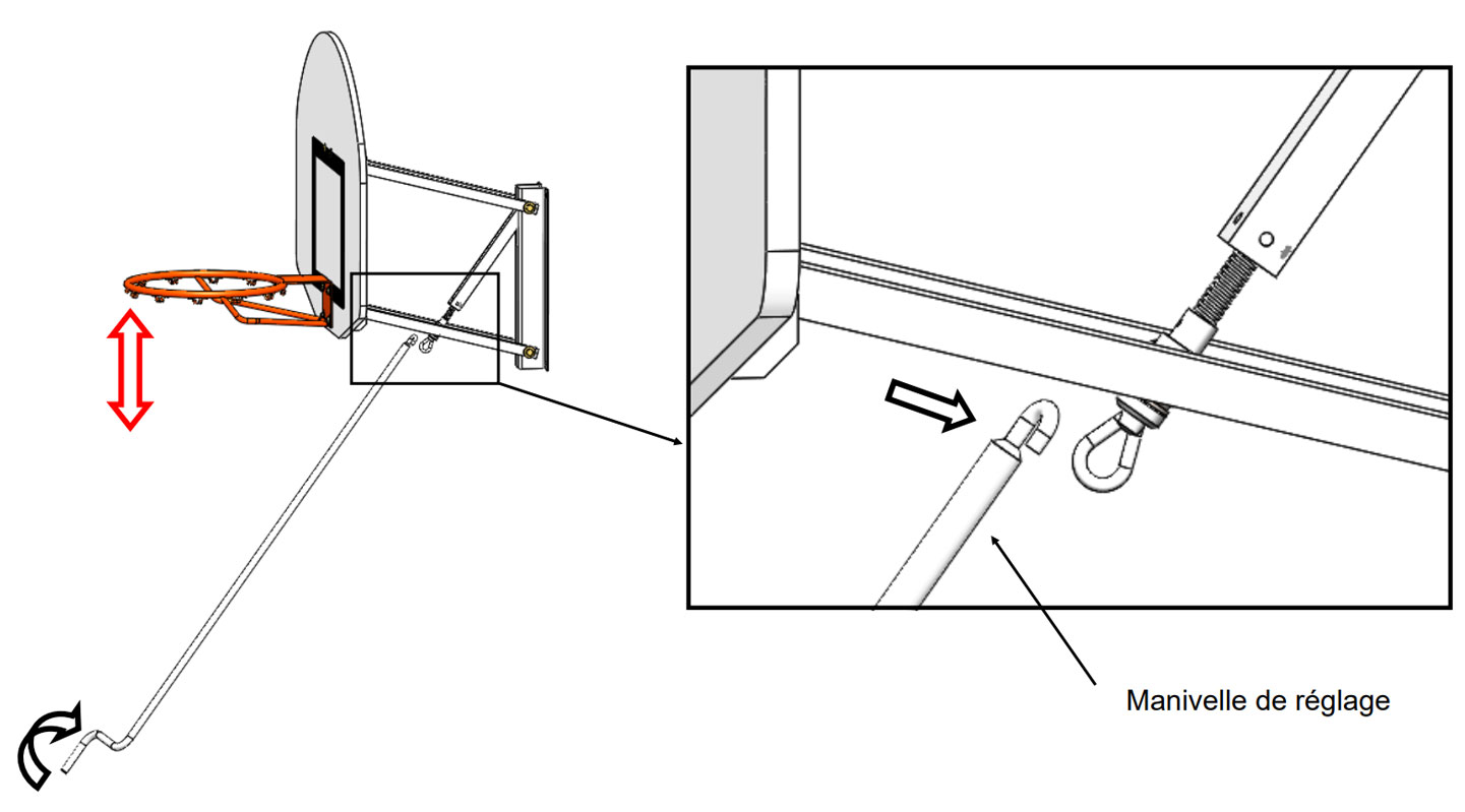 But de basket réglable de 2,60 ou 3,05 m avec un déport de 0,60 m. Le but est fourni avec le panneau demi-lune, le filet et le cercle. Le réglage s'effectue à l'aide d'une manivelle (en option). Le but de basket est en acier plastifié blanc. Il est préférable de l'utiliser en intérieur puisque l'acier n'est pas galvanisé.