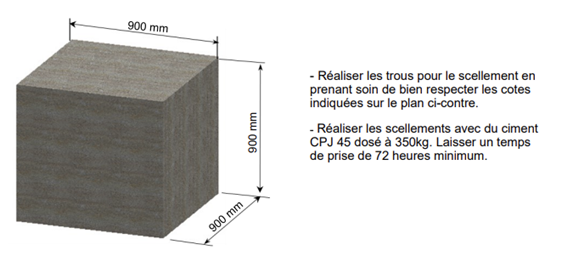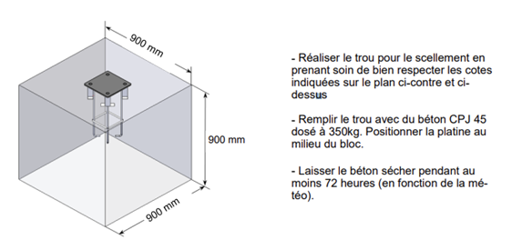 - Pour la fixation, deux solutions s'offrent à vous : la première, fixation directement de la platine dans un bloc de béton de 90 x 90 cm (visserie non fournie).