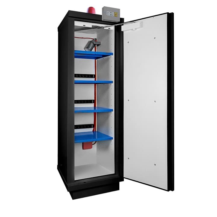 L'armoire de protection pour batteries protège aussi bien de l'intérieur que de l'extérieur. En effet, si un incendie ou un emballement thermique se déclenche au sein de l'armoire, l'extincteur se déclenchera grâce au détecteur, permettant ainsi de ne pas répandre le feu dans l'enceinte du bâtiment. À l'inverse, si un incendie se déclenche dans le bâtiment, l'armoire anti feu avec recharge et l'armoire anti feu avec alarme protégeront, durant 90 min, leur contenu.