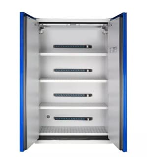 Aussi, les batteries au lithium-ion doivent être stockés dans une armoire coupe-feu également pour le risque chimique et le risque d'incendie qu'elles représentent.