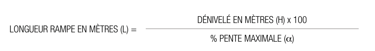Comme vu plus haut, l'angle maximal autorisé est de 30% de dénivelé. La longueur de votre rampe de chargement va donc dépendre de cela. Il suffit d'appliquer le calcul suivant :