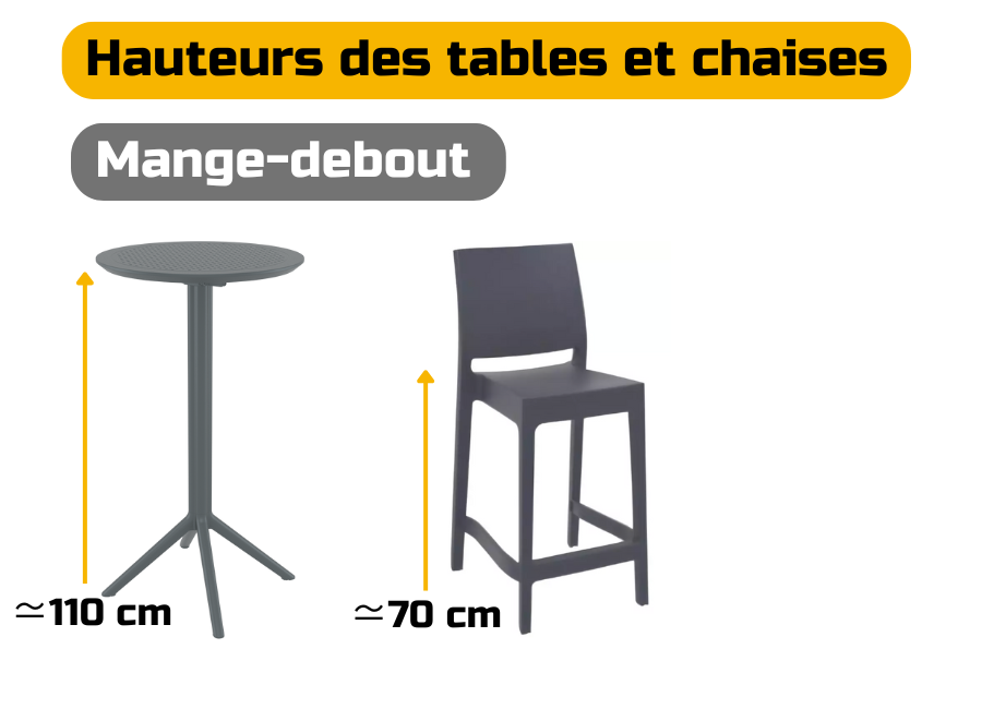 Vous pouvez opter pour un mange-debout afin d’avoir un espace cosy. Les tables ont une hauteur d’approximative de 110 cm et les chaises hautes ou les tabourets de bar une hauteur d’assise d’environ 70 cm.