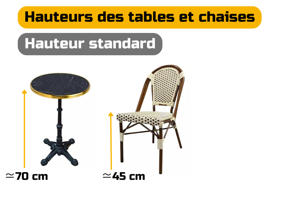 La hauteur standard d’une table est d’environ 70 cm et la hauteur d’assise d’une chaise d’environ 45 cm.