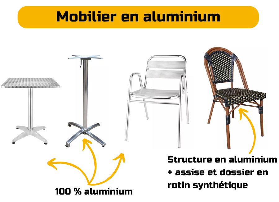 L’aluminium est un matériau qui est également très léger. Il est très tendance et donne un aspect industriel à la décoration. Nous vous proposons des tables restaurant 100 % en aluminium ou avec des plateaux en rotin. Nous proposons également une gamme Bolero de chaise en aluminium.