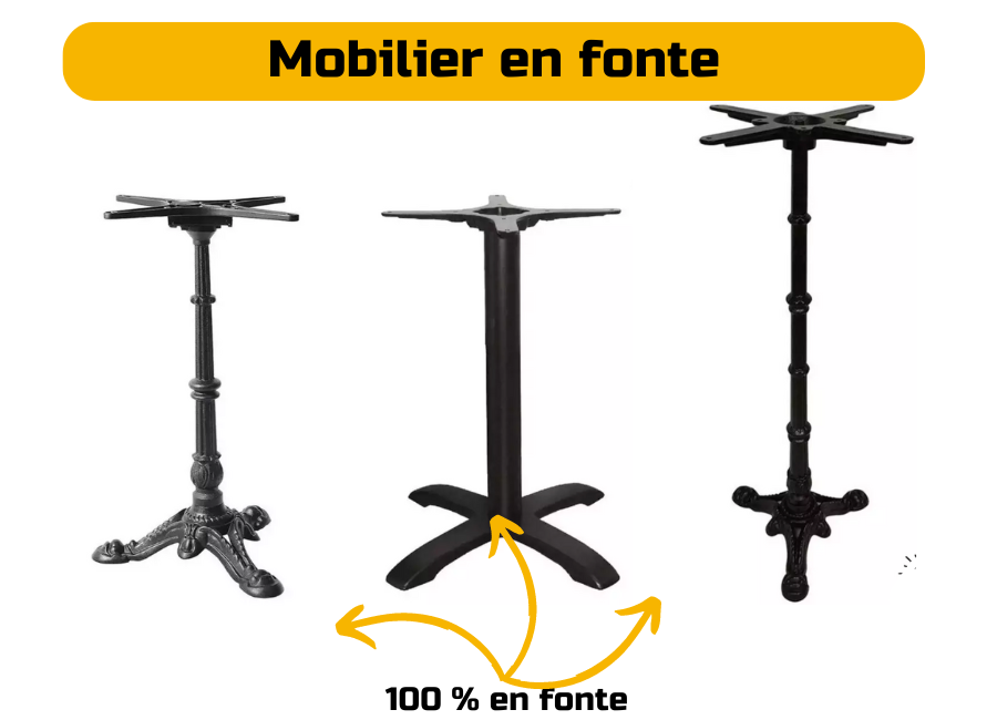 Nous proposons également des pieds de table en aluminium. Ils ont pour avantage d’être très léger contrairement à la fonte. Ils sont ainsi déplaçables facilement.