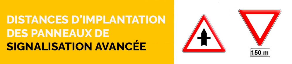 La distance d'implantation des panneaux routiers avancés type AB1, type AB2, type AB3b et type AB5 est de 150 mètres environ. Cette distance peut toutefois varier en fonction de la disposition des lieux, de la vitesse de la circulation ou dans les cas indiqués ci-dessous. Elle peut atteindre 400 m sur les routes à très bonne visibilité parcourues par une circulation rapide. La vitesse de circulation étant plus rapide hors agglomération qu'en agglomération (limitation de vitesse supérieure à 50 km/h), les panneaux sont implantés plus en amont hors agglomération qu'en agglomération.