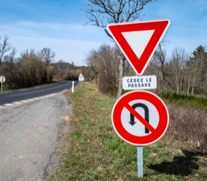 La combinaison traçage au sol et panneau de signalisation permet d'augmenter la visibilité du cédez-le-passage.