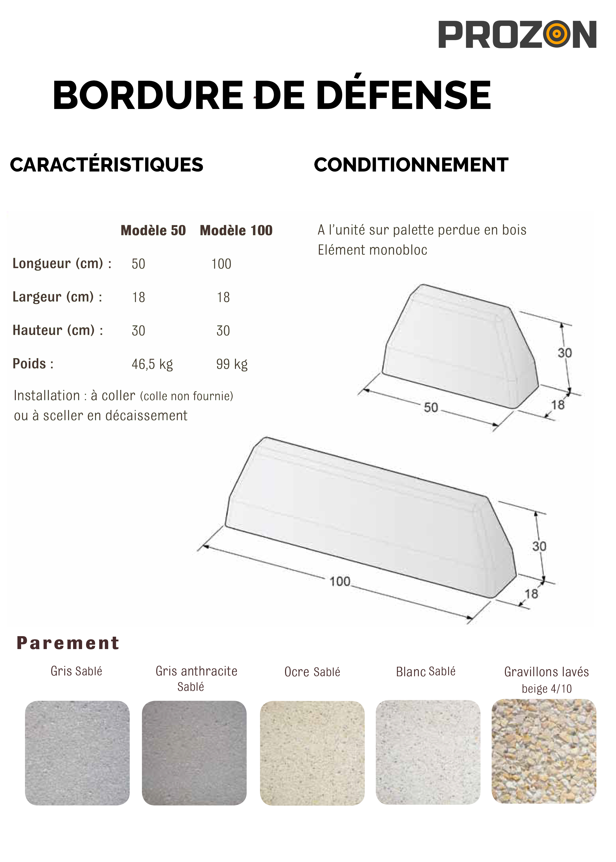 Conçue en béton, elle résistera aux chocs, intempéries et autres agressions extérieures. Afin qu’elle s’intègre au mieux à l’environnement dans lequel elle sera installée, nous vous proposons la bordure anti-stationnement en 4 parements différents :