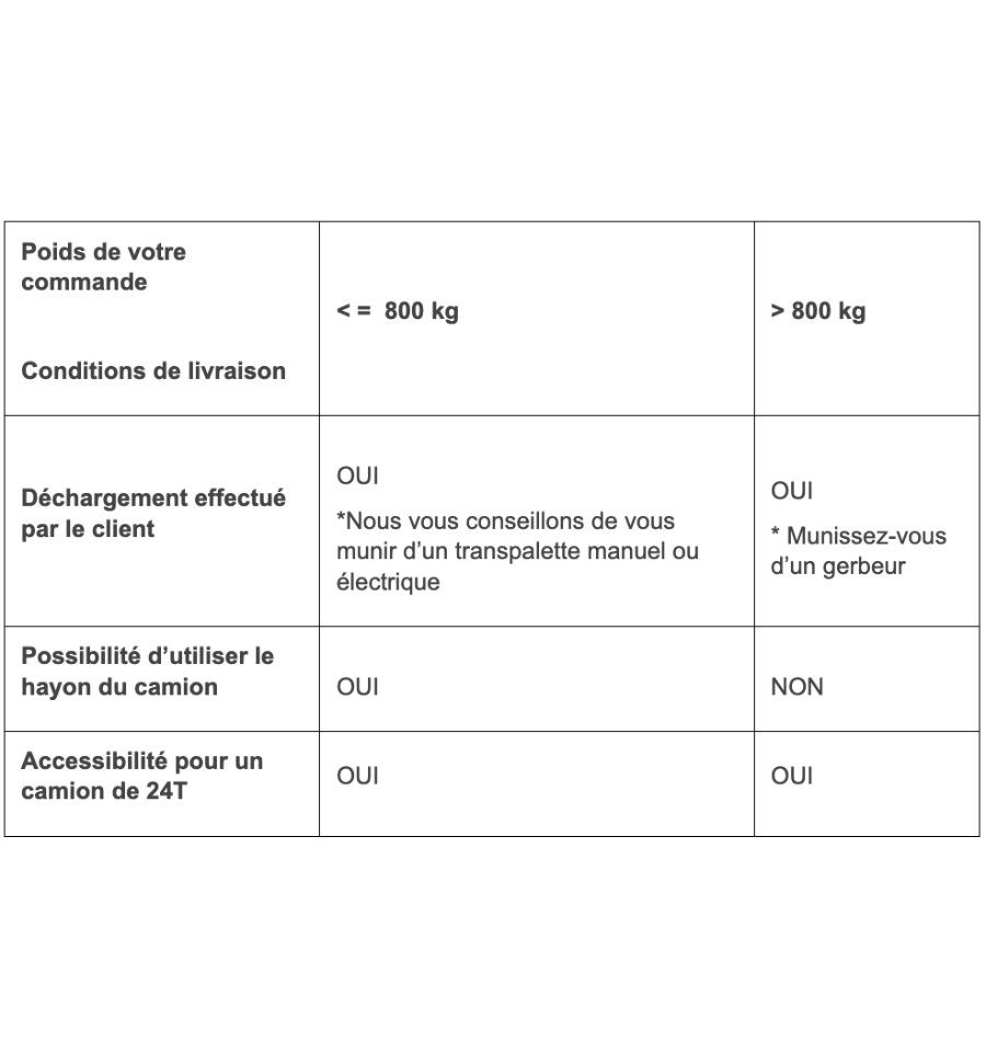 OUI *Nous vous conseillons de vous munir d’un transpalette manuel ou électrique |