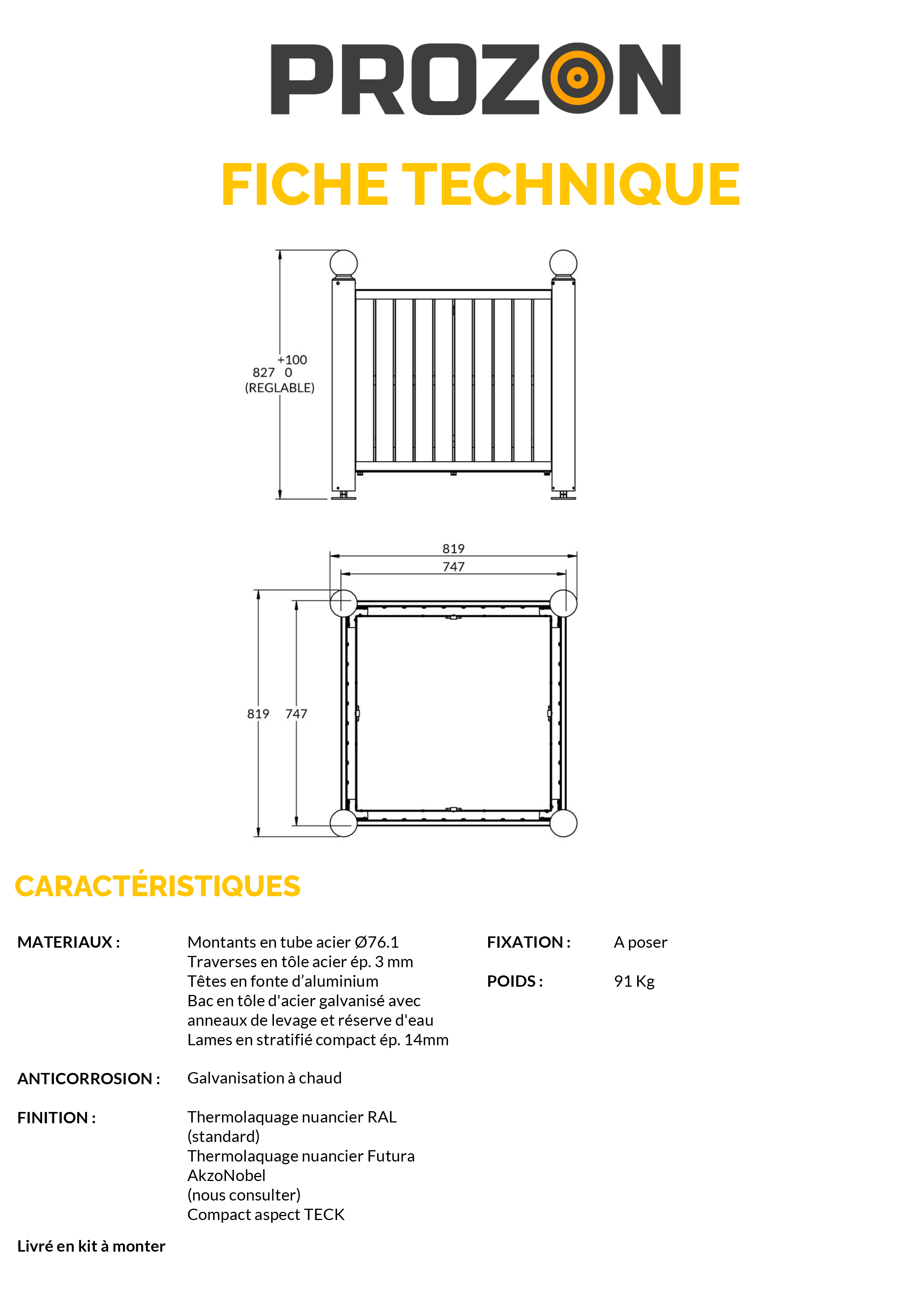 Le bac en acier galvanisé est carré et des anneaux de levage ont été ajoutés afin de faciliter son installation. Une réserve d'eau est aussi présente au fond du bac.