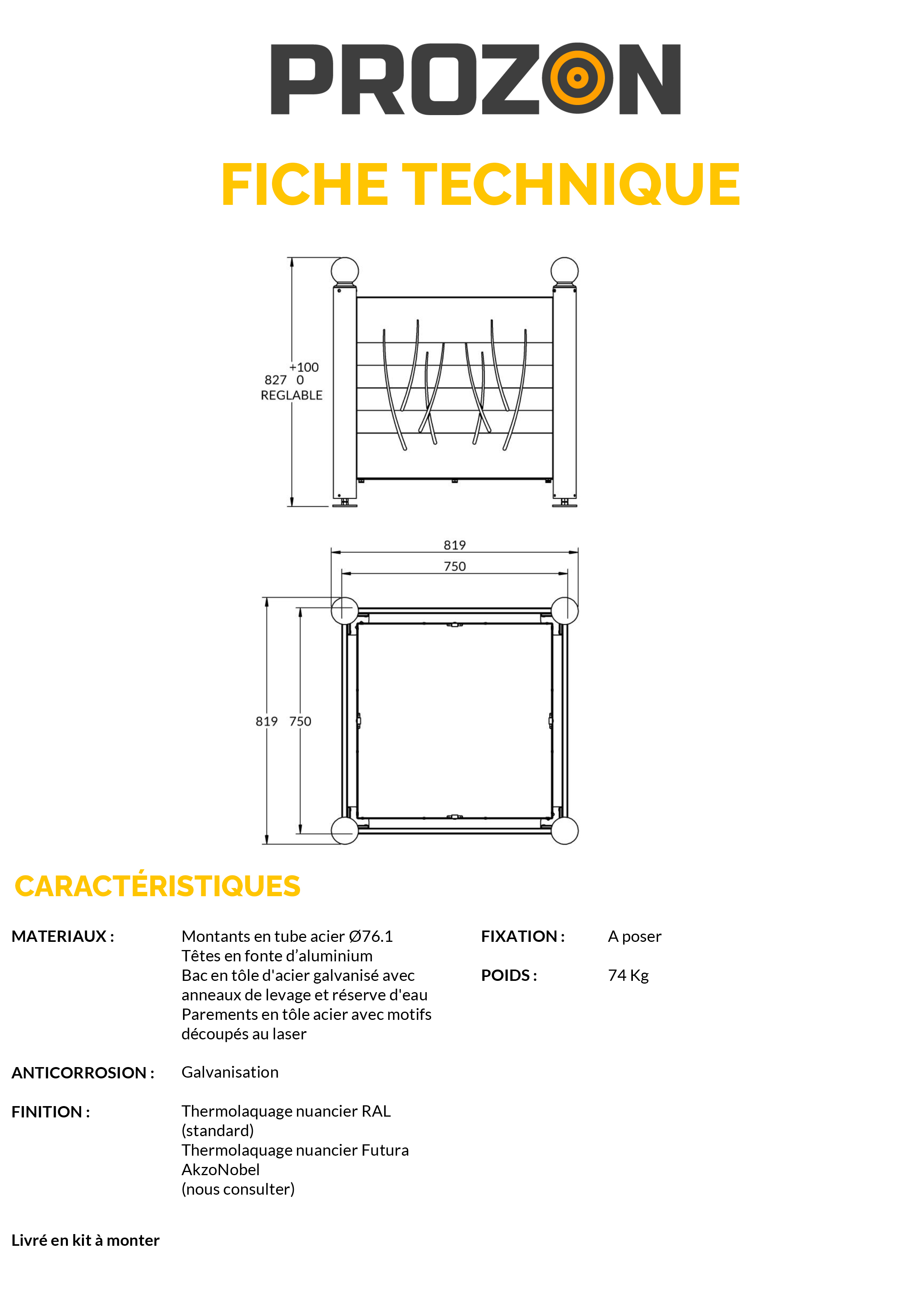 Elle est composée de tubes en acier de Ø 76 mm et d'un bac en tôle d'acier galvanisé. Les anneaux de levage et la réserve d'eau inclus, en font une jardinière pratique à installer et à entretenir. Ses pieds sont réglables.