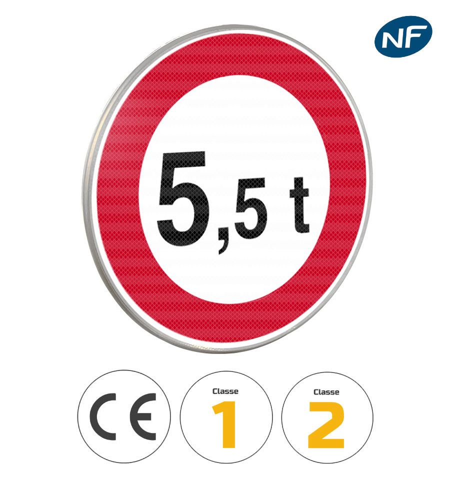 Le panneau B13 est de forme ronde à fond blanc et bordure rouge. En son centre se trouve un chiffre noir : la limite de tonnage. Le panneau B13 est entièrement personnalisable : vous pouvez choisir le poids que vous voulez faire inscrire sur le panneau (exemple : 5,5 t ou 7,5 t) !
