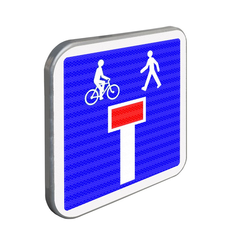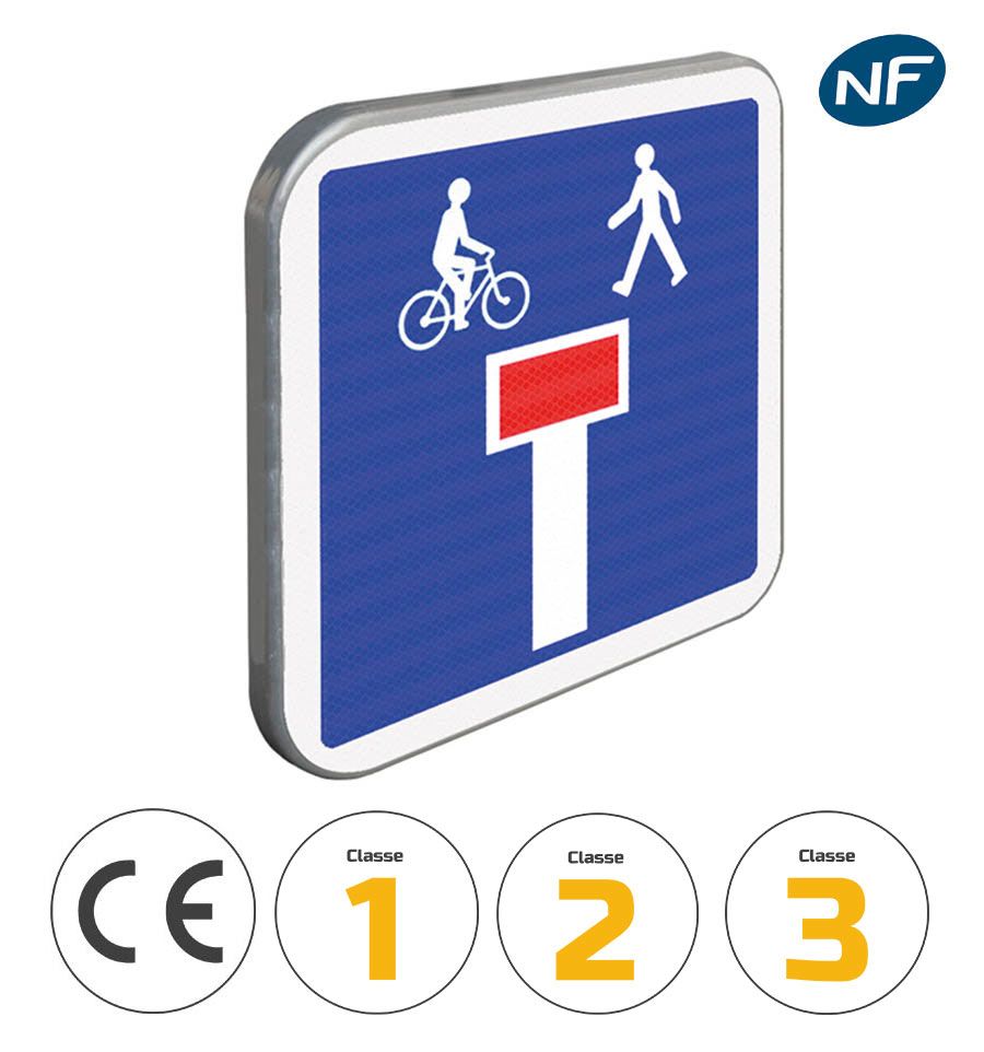 Ce panneau est carré à fond bleu avec un listel blanc, au centre se situe le symbole impasse sans issue avec au-dessus un piéton et un cycliste.