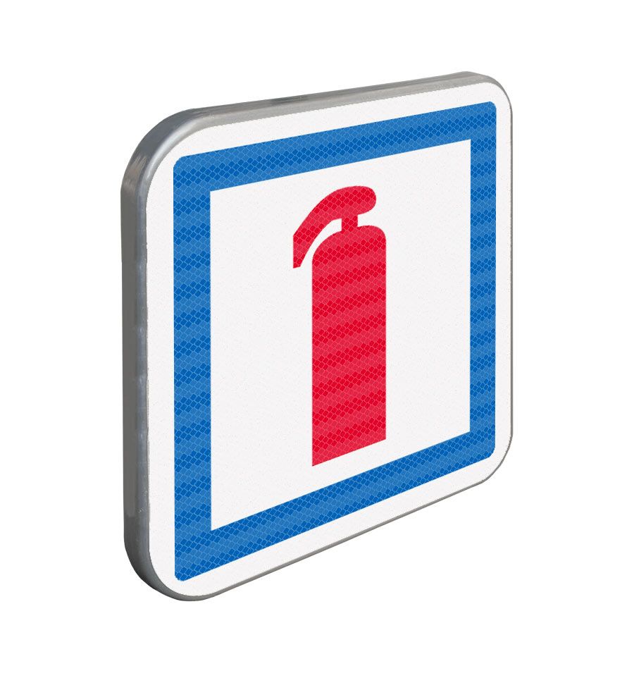 Ce panneau est carré à fond bleu, bordé d’un listel blanc. Il porte en son centre un pictogramme de couleur rouge représentant un extincteur.