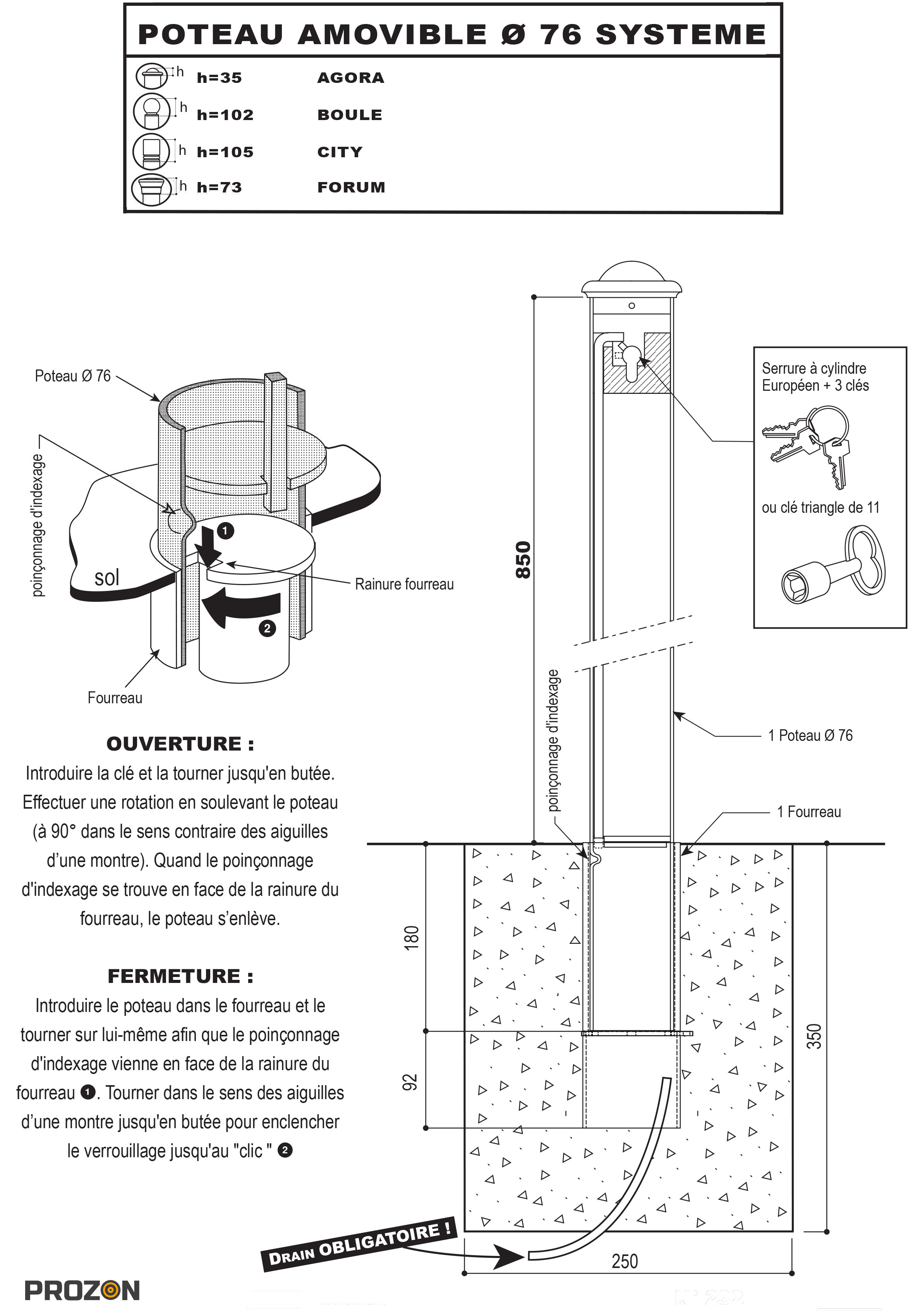 Son système de serrure situé en haut du potelet permet de le placer et de le retirer avec une grande facilité sans avoir à se baisser. Les potelets sont verrouillables grâce à un système de clés disponibles sous trois formats selon votre choix : 3 clés identiques, 3 clés différentes ou 1 clé de triangle de 11 mm pour permettre l’accès aux pompiers. Le potelet est monté sur un fourreau spécifique à sceller.