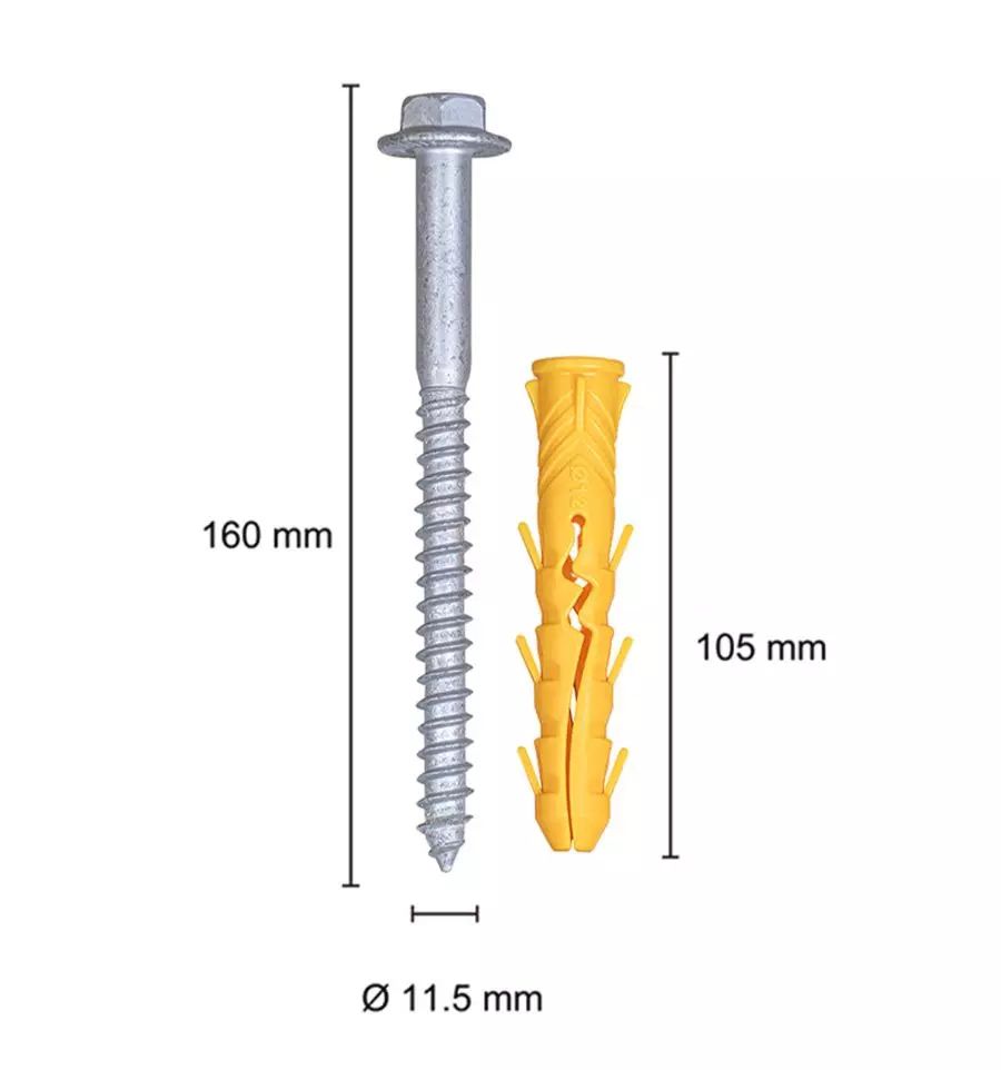 Les chevilles livrées avec le ralentisseur font 105 mm de longueur et 17 mm de diamètre. Les tirefonds ont un diamètre de 12 mm et ont une longueur de 160 mm. Ce système de fixation certifie la stabilité du ralentisseur.