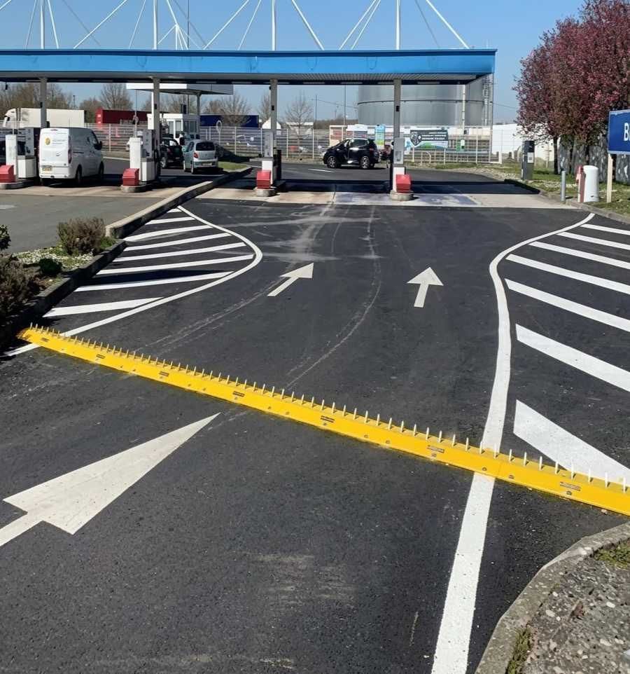 La herse anti-recul est un dispositif dissuasif à dents qui sécurise la circulation en empêchant les véhicules de reculer et en faisant respecter le sens de circulation, aussi bien sur la voie publique que dans les espaces privés comme les stations-service.